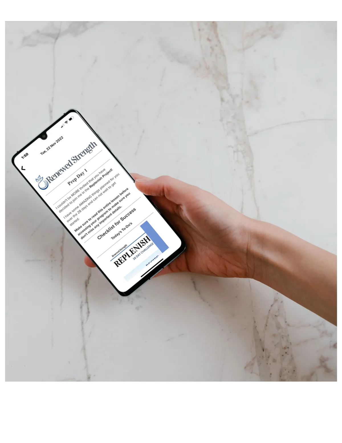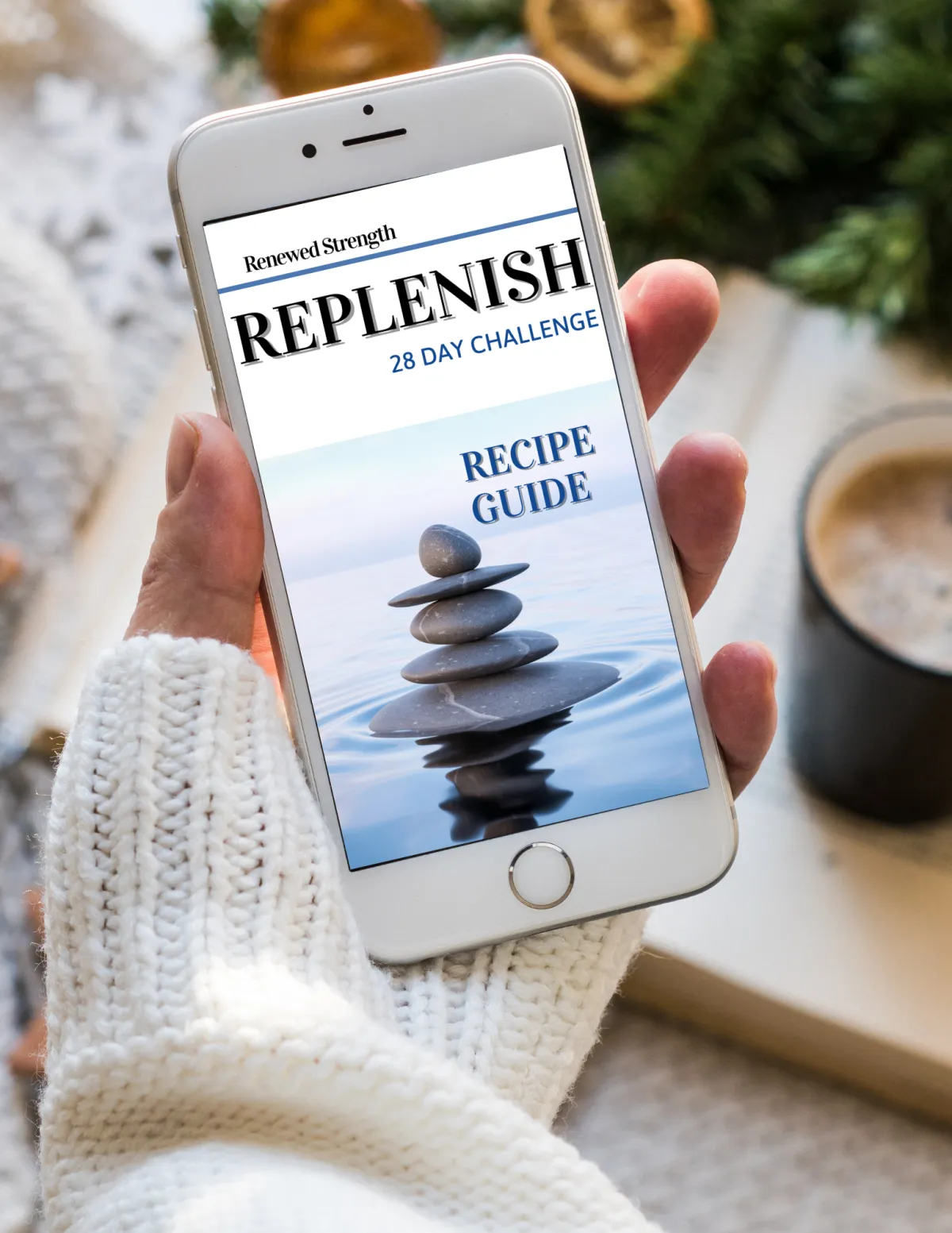 Replenish is a 28-day nutrition program designed specifically for women who want to restore their energy, sleep, mindset, and body through nutrition and healthy habits without feeling overwhelmed.